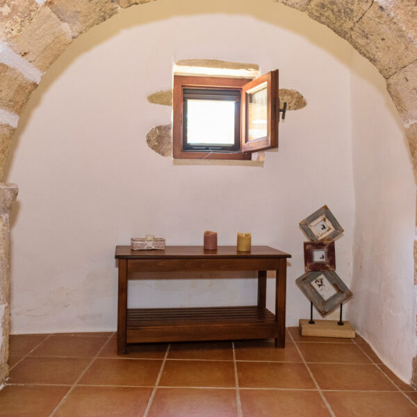 Passing through an original stone arch from dining area to a spacious living room there is a TV, sofas, fireplace & antique piano.