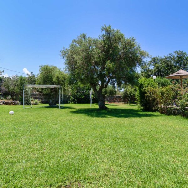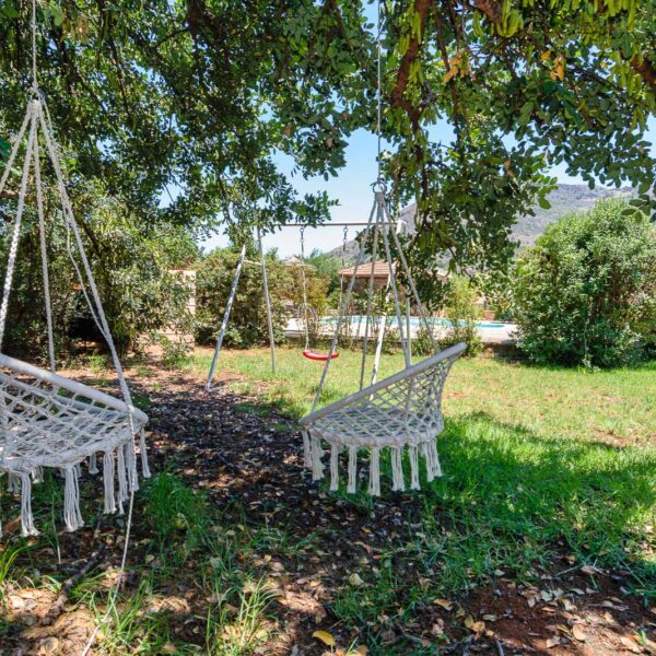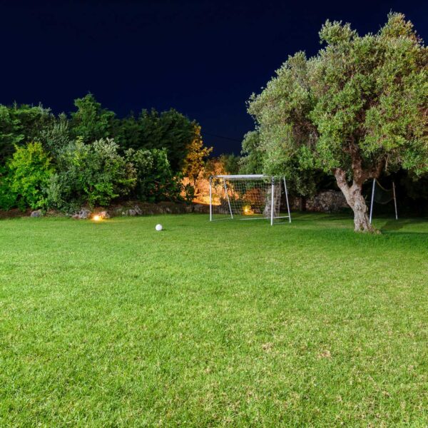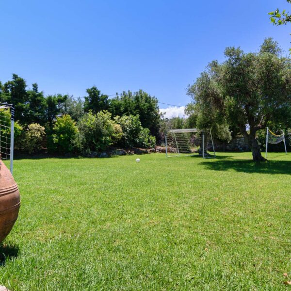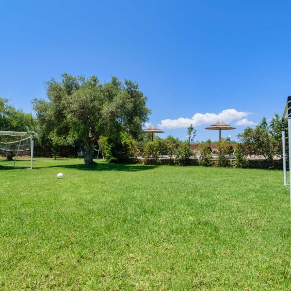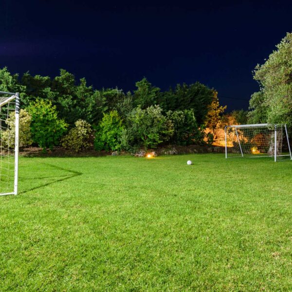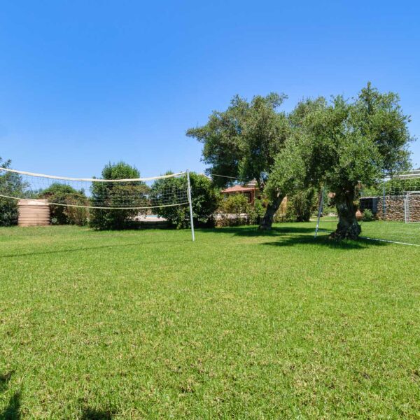 Next to the pool there is a large field with a football and volleyball court along with swings.